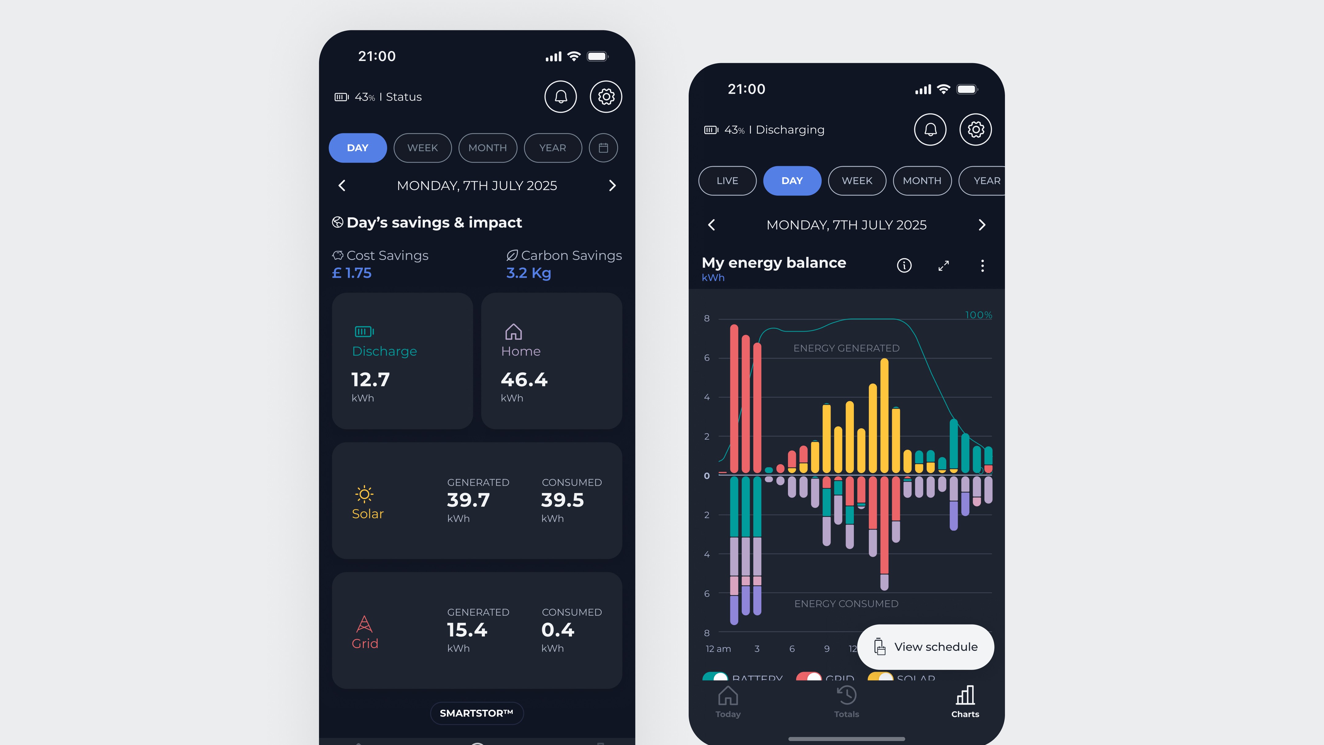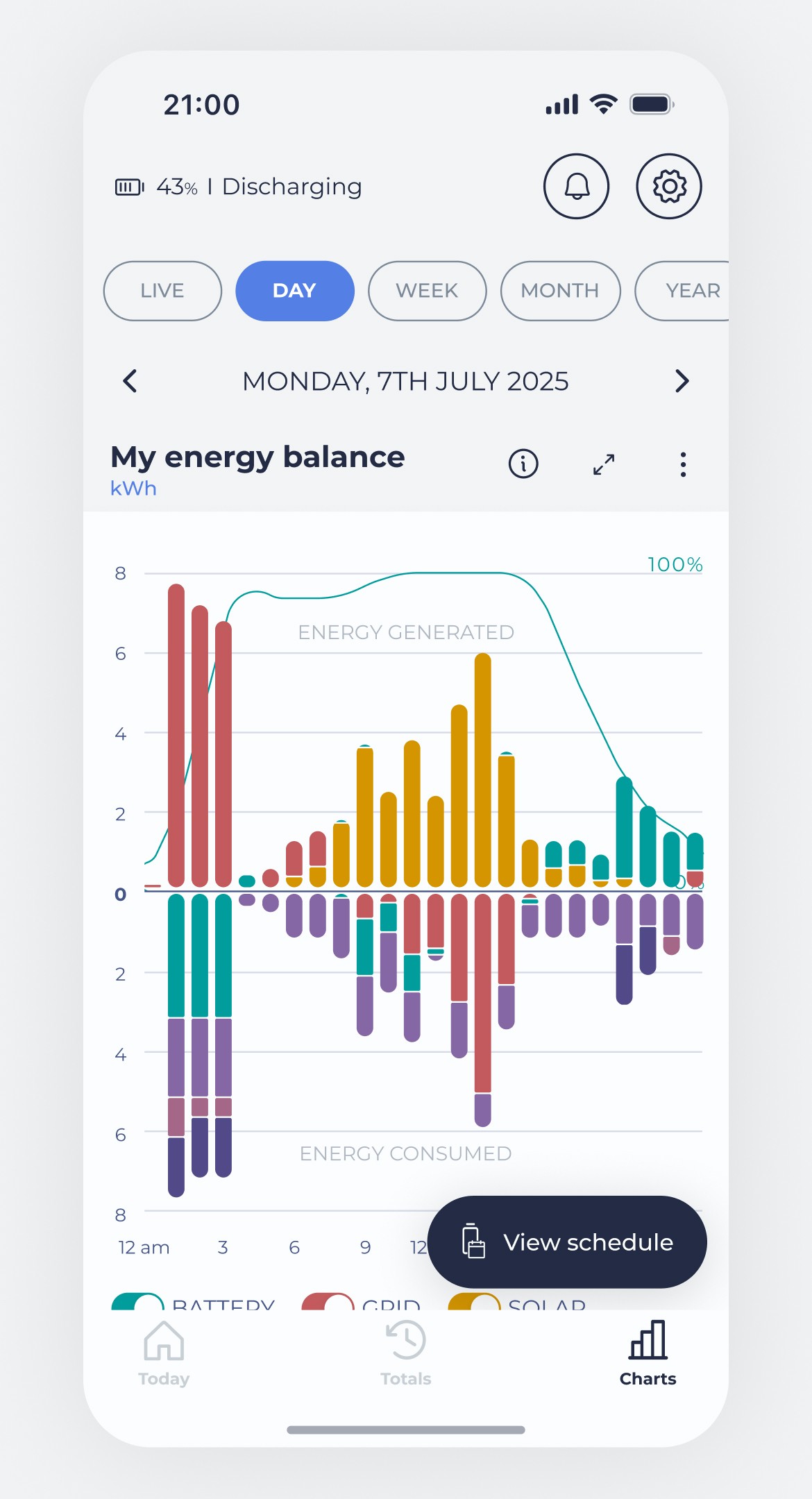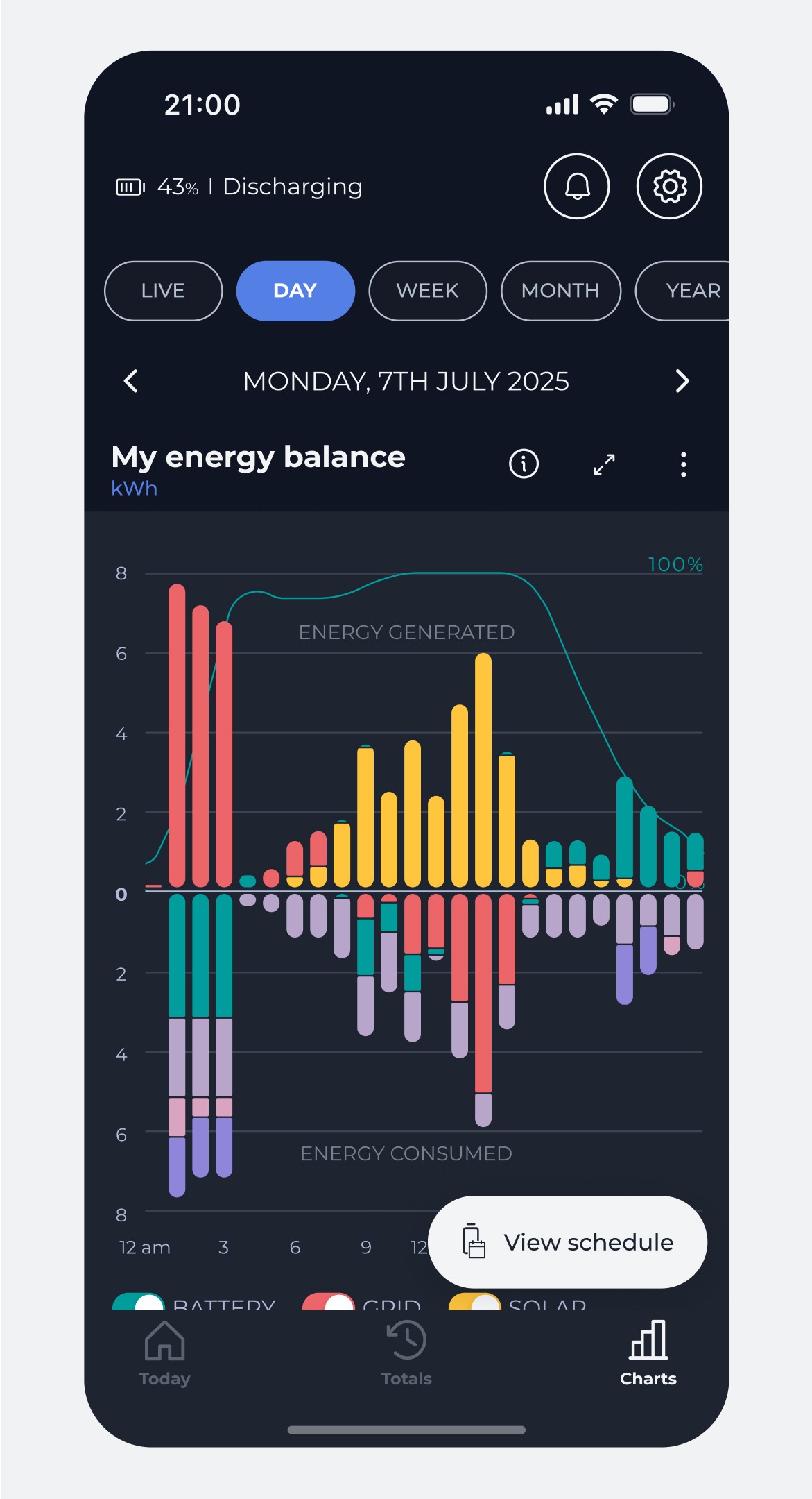 Charts & data design: clear time ranges, energy balance (solar, battery charge/discharge, grid import/export) with plain-language labels and helpful tooltips.